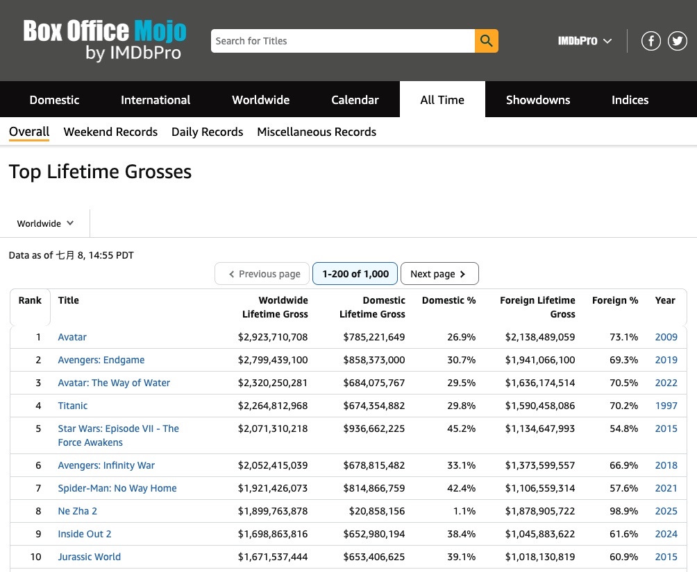 近日有传闻称,北美票房统计平台Box Office Mojo于2025年3月17日将《哪吒2》的票房数据从全球榜单中移除。