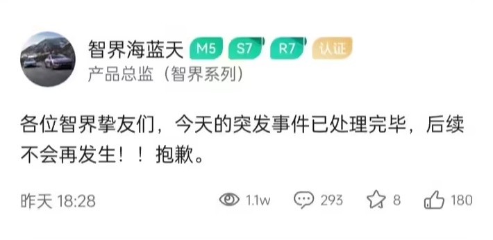 对此,智界系列产品总监“海蓝天”当天晚上连忙更新动态向车友道歉,并表示直播已关闭,并承诺不再发生类似事件。